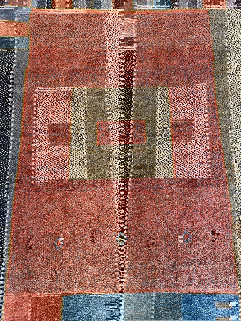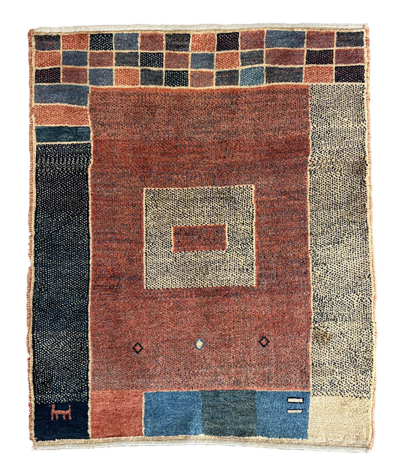 Typical of Gabbeh weaving, the composition is deliberately pared back, allowing the natural wool pile and beautifully restrained palette to stand out. Small, symbolic details – including a tiny animal motif in the corner and three discreet lozenges across the field – give the carpet a quiet, personal charm without disturbing its calm geometry.