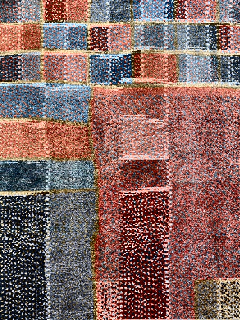 This piece is built around a large brick-red field, anchored by a stepped square in soft stone and charcoal tones at the centre. To one side, a finely mottled panel in cream and dark brown adds texture and movement, balanced on the opposite edge by a deep midnight section that grounds the design. Along the top, a loose checkerboard of terracotta, indigo and inky blue tiles introduces a playful rhythm, echoed again in the colour blocks across the lower border.