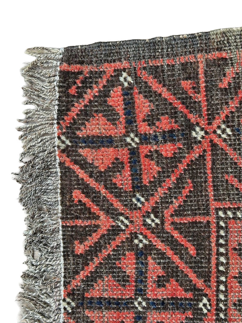Woven with hand-spun wool on a wool foundation, the texture is supple yet dense, embodying the utilitarian purpose and artistic sensibility of the Balouch weaving tradition. Despite its compact format, this rug makes a strong visual statement, offering warmth, depth, and character to any space.
