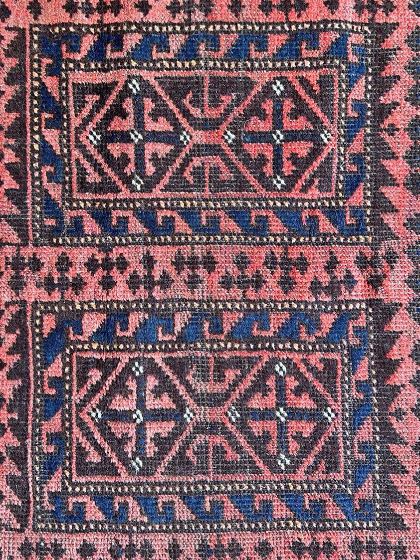 Perfect as an accent rug, wall hanging, or layered textile in contemporary or traditional interiors, this Balouch piece is a collectible fragment of nomadic Persian culture—subtle in palette yet striking in its tribal geometry.