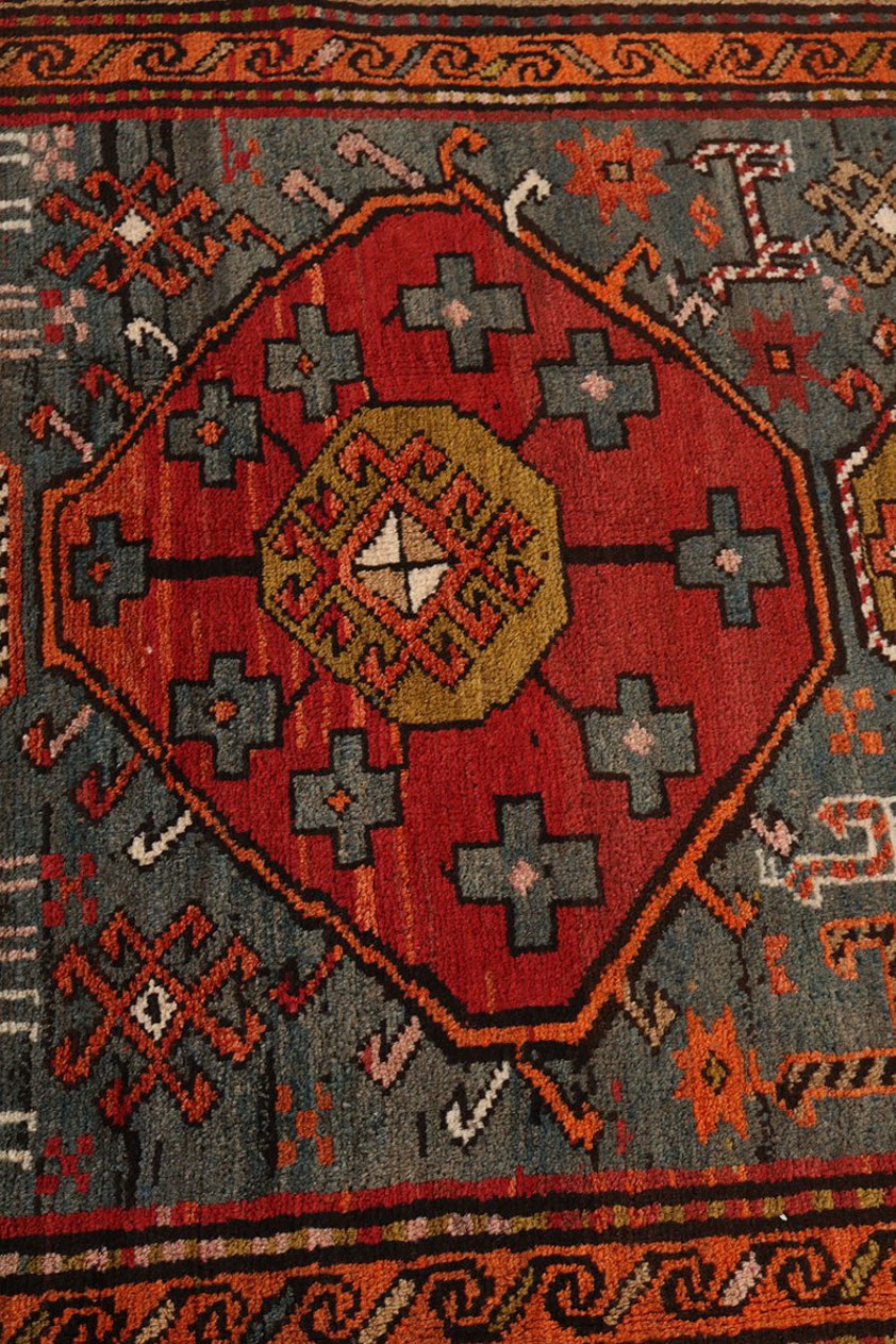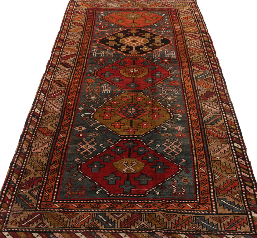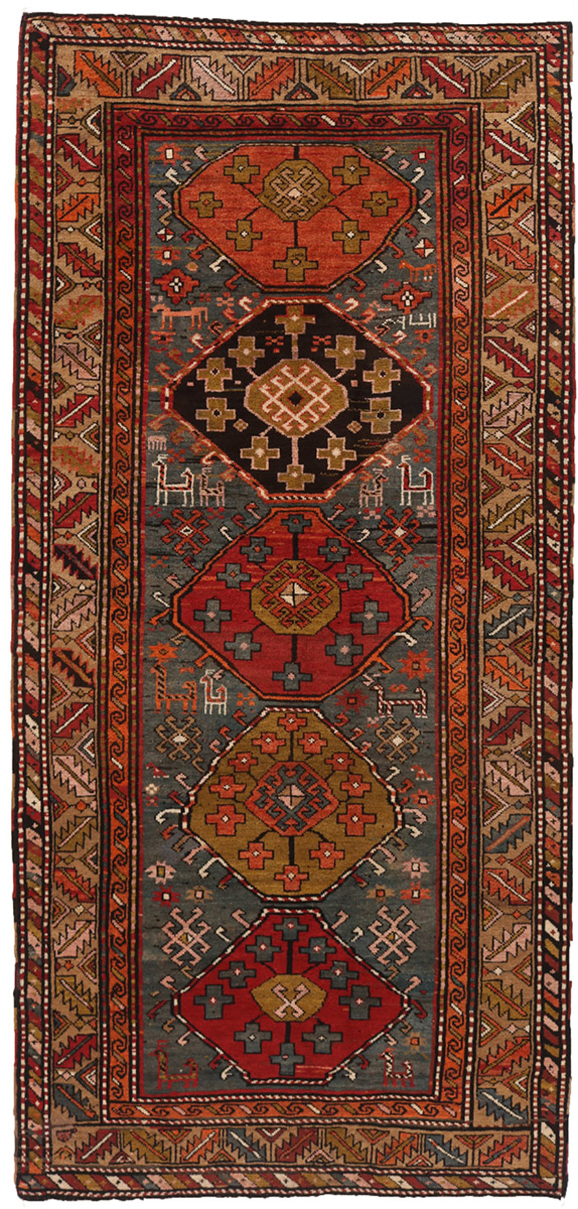 The field is organised around a powerful vertical sequence of stepped medallions, each rendered in warm madder reds, soft rusts, and earthy ochres, set against a beautifully aged indigo-grey ground. These medallions are interspersed with small tribal motifs—stylised animals, protective symbols, and abstract devices—woven with an instinctive balance that is characteristic of authentic Qashqai work. The drawing is confident yet slightly irregular, lending the rug a vitality and humanity that only genuinely tribal pieces possess.
