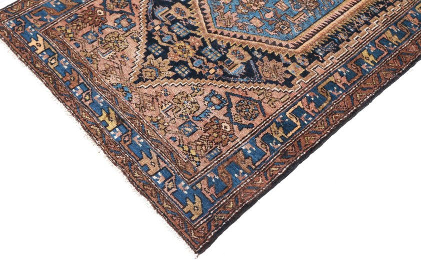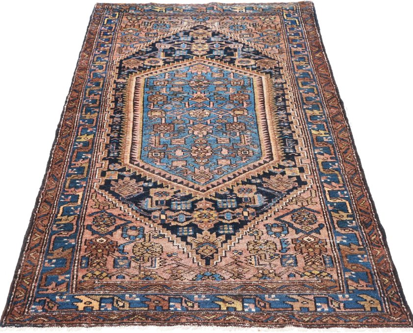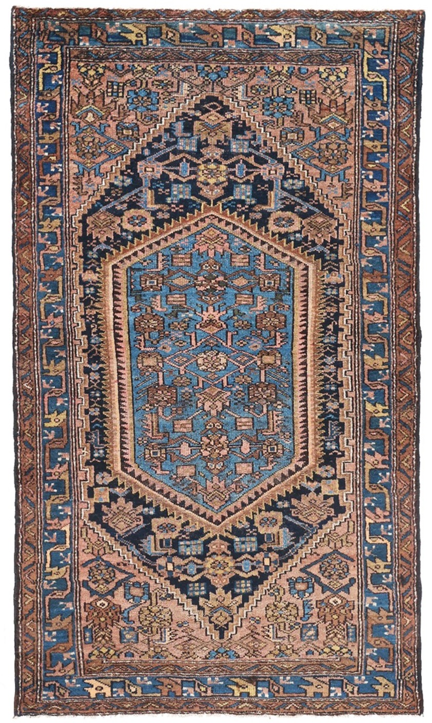 The composition is centred around a bold, elongated hexagonal medallion set within a stepped field, a hallmark of Zanjan craftsmanship. Surrounding motifs include stylised floral elements, angular vinery, and symbolic geometric forms, all rendered with a confident, slightly naïve charm that gives the rug its character. The palette combines soft terracotta and muted rose tones with deep indigo and accents of sky blue and ivory, creating a warm yet balanced visual effect.