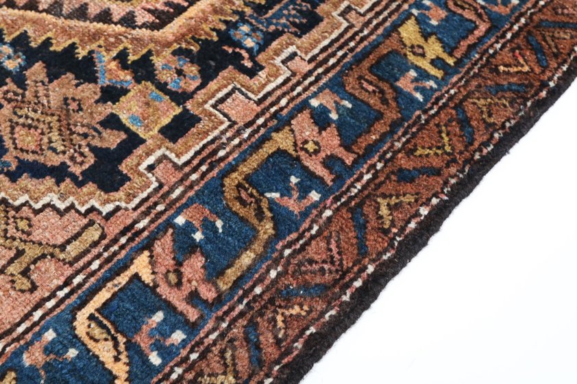 The border is particularly notable, featuring repeating geometric figures and stylised animal-like motifs, adding rhythm and contrast to the overall design. The slightly aged patina enhances the authenticity of the piece, while the firm weave ensures lasting durability. This rug works equally well in traditional interiors or as a grounding element in more contemporary settings, where its structure and colour can provide both warmth and visual interest.