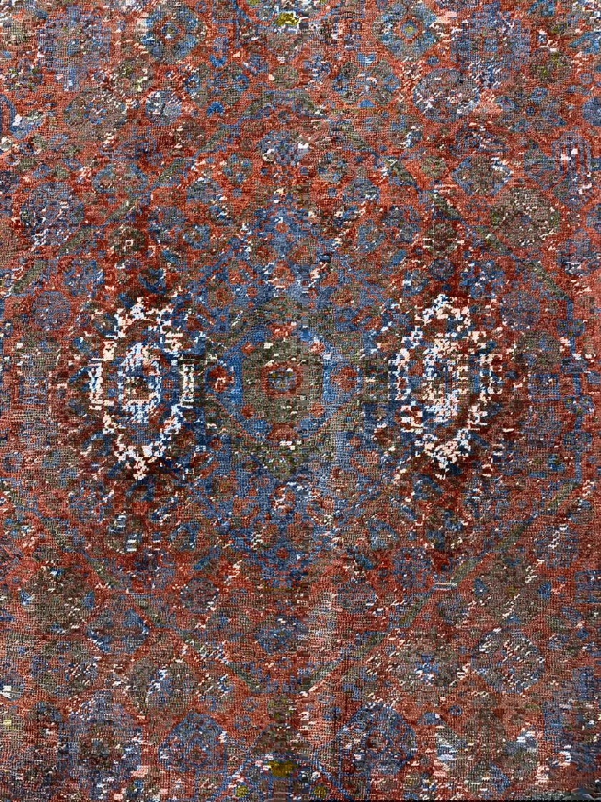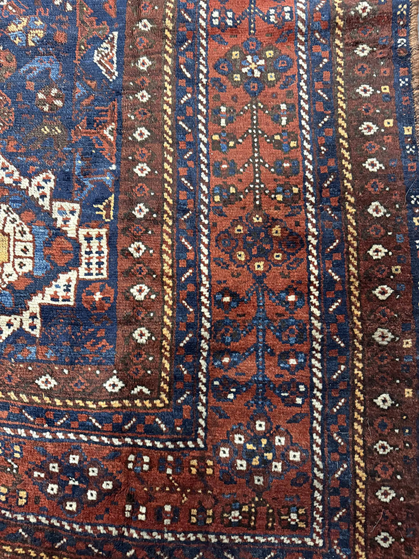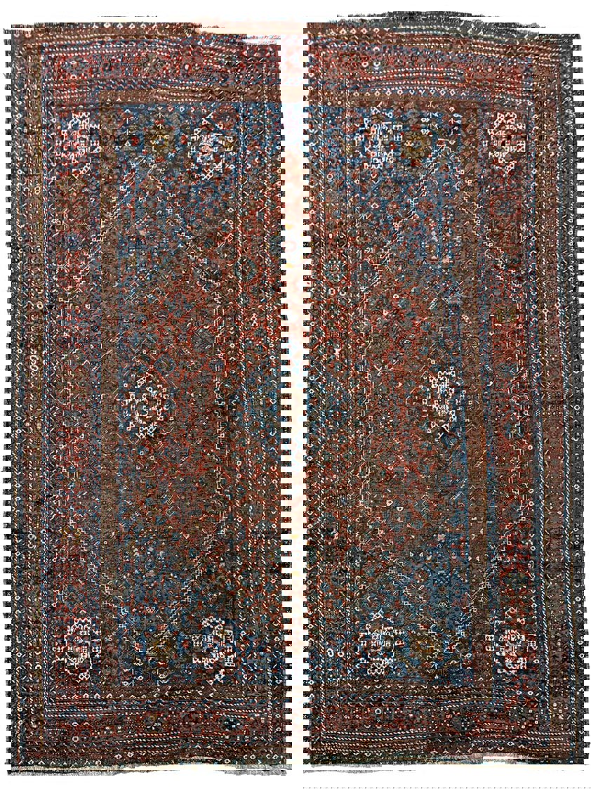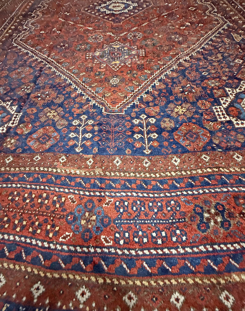 In each corner, decorative elements echo the geometry of the central medallion, helping to balance the composition, while multiple borders filled with small repeating motifs frame the rug and reinforce its rhythmic structure. The colours, derived from traditional natural dyes, have mellowed beautifully with age, producing the deep blues, warm reds, and earthy tones that are characteristic of antique Kamseh weavings.