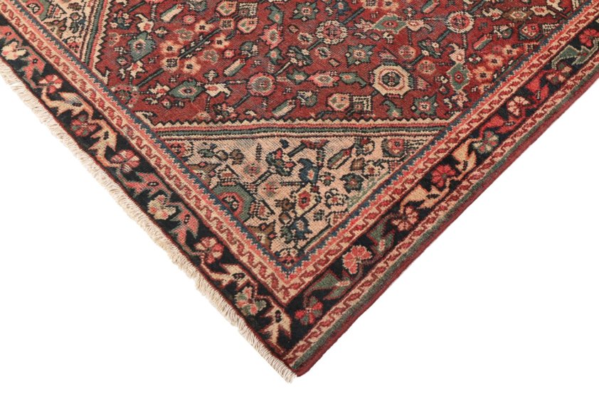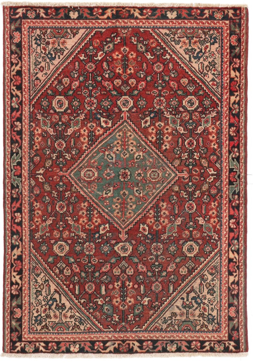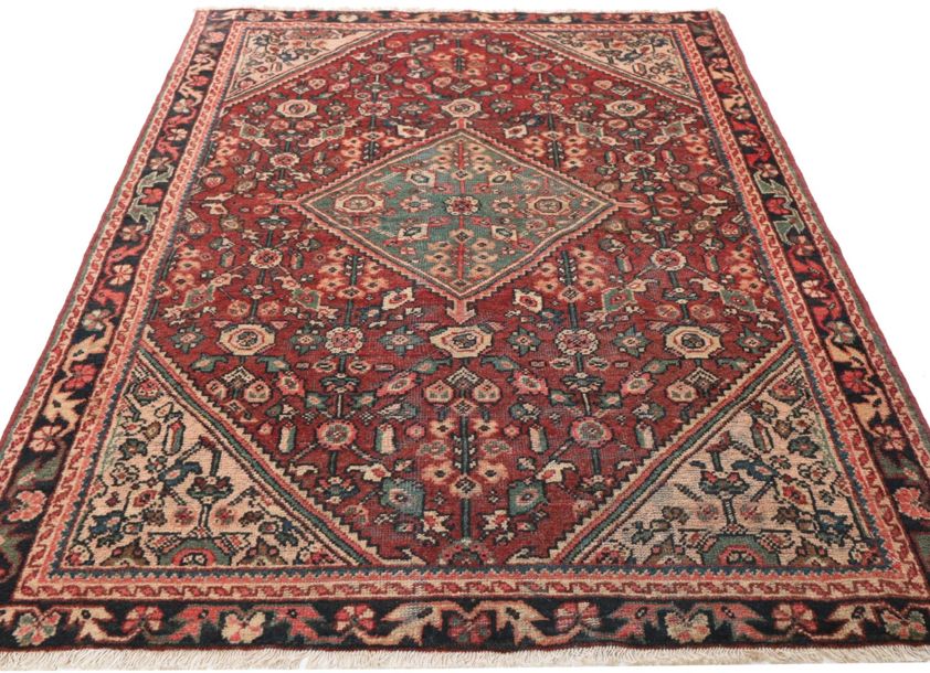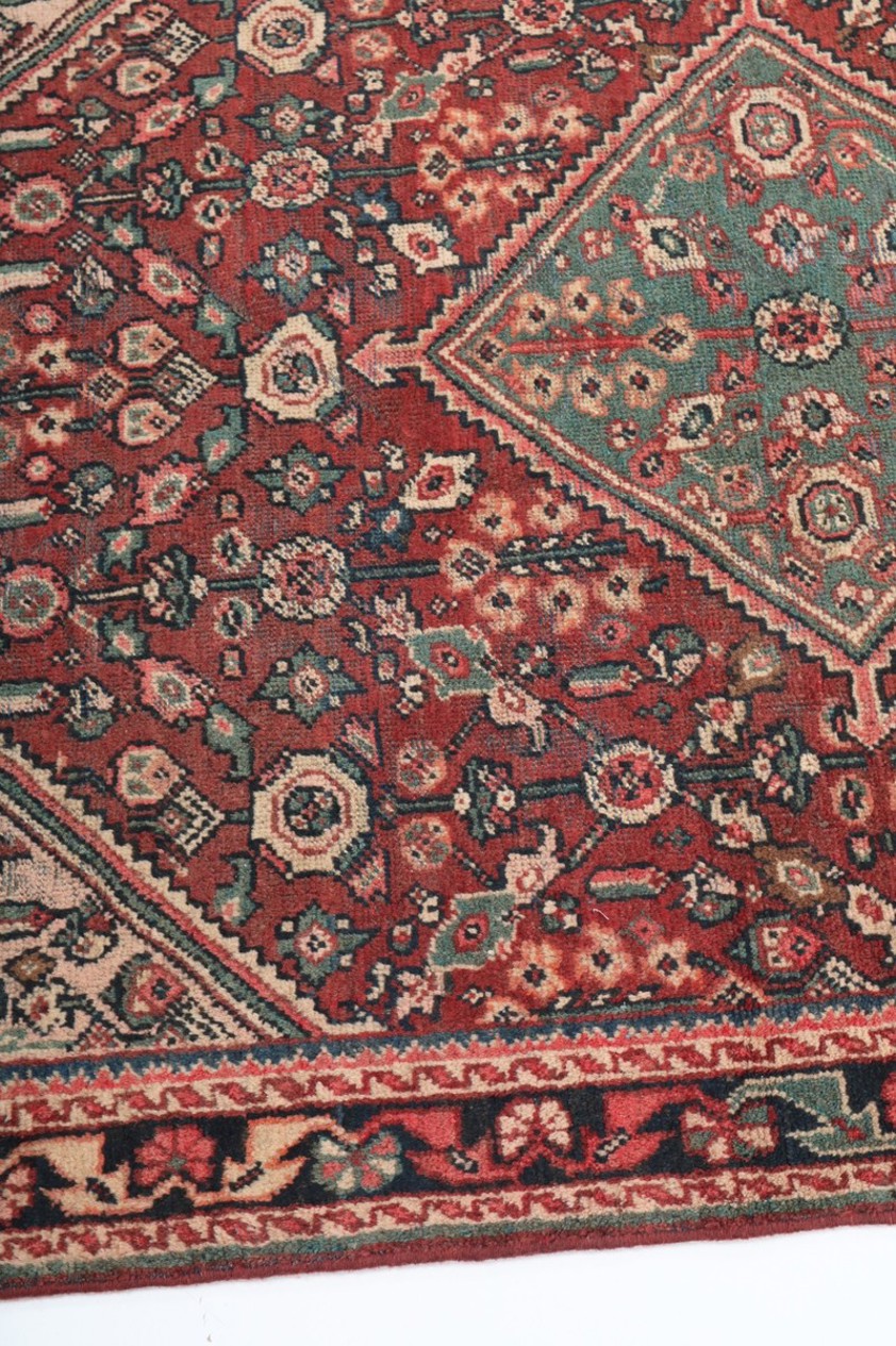 The rug is set upon a rich madder-red field, a colour deeply associated with traditional Persian dyeing techniques. At its centre sits a striking geometric medallion in soft teal tones, creating a strong visual anchor while offering contrast against the warmer ground. Surrounding this are stylised floral motifs arranged in a repeating lattice-like formation, lending both structure and rhythm to the design. The ivory corner spandrels provide balance, gently framing the central composition and enhancing the overall sense of symmetry.