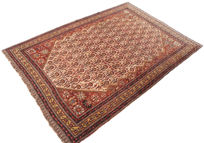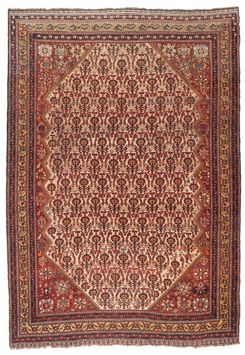 Woven by the nomadic Qashqai tribes of southern Persia in the late 19th to early 20th century, this antique Persian Qashqai rug is a compelling example of tribal craftsmanship at its most accomplished. The composition centres on a densely patterned field arranged in a rhythmic lattice of boteh-inspired motifs, each rendered with remarkable clarity and balance. These repeating forms are framed by stepped spandrels and enclosed within a series of finely articulated borders, creating a sense of order that contrasts beautifully with the innate spontaneity of tribal design.
