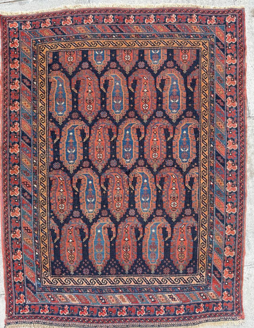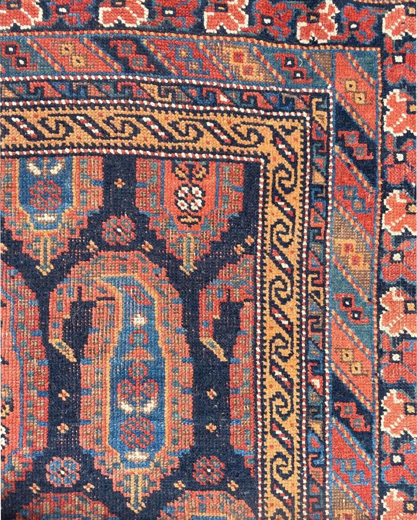 The composition features a striking dark indigo field, arranged with a rhythmic grid of elongated boteh motifs. These forms, often interpreted as symbols of life, fertility, or flame, are rendered in warm terracotta, soft gold, and muted turquoise tones. The surrounding borders introduce a lively contrast, with angular floral elements and geometric guards that frame the central field with clarity and balance. The use of natural dyes is particularly evident here, with colours that have softened and harmonised beautifully over time.