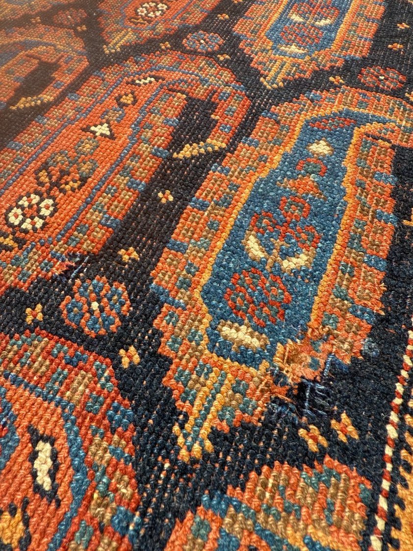This antique Persian Qashqai rug is a vivid example of nomadic weaving from the tribes of south-west Iran, particularly the Fars province. Woven by the Qashqai people—renowned for their rich textile traditions—these rugs were created on horizontal looms during seasonal migrations. Their designs are typically instinctive rather than formally planned, resulting in pieces that feel both expressive and deeply rooted in tribal heritage.