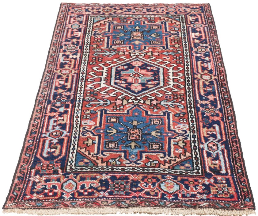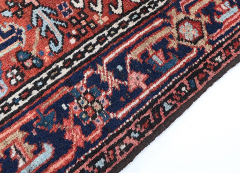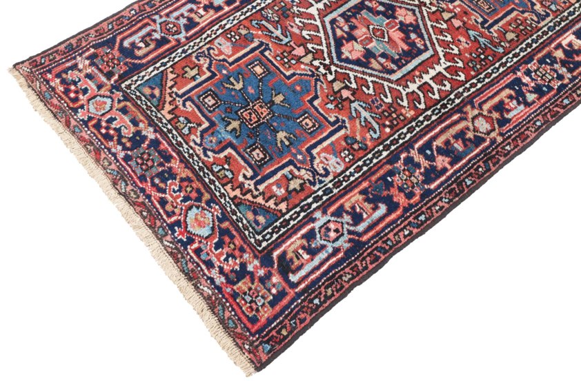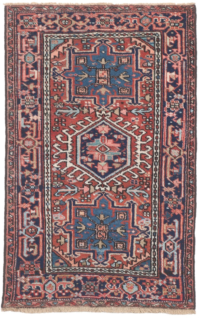 This characterful vintage Karadja rug originates from north-west Iran, a region renowned for producing highly durable and finely detailed village weavings. Woven in wool on a cotton foundation, the piece features a bold geometric medallion composition framed by an intricate border rich with tribal motifs. The palette combines deep indigo blues with warm reds and soft ivory accents, creating a striking contrast that remains versatile within both traditional and contemporary interiors. The slightly irregular drawing and visible abrash lend authenticity and a sense of movement, while areas of gentle wear add to its charm, telling the story of a well-loved and enduring textile. Compact in size, it is well suited to hallways, smaller living spaces, or as an accent piece layered within a room.