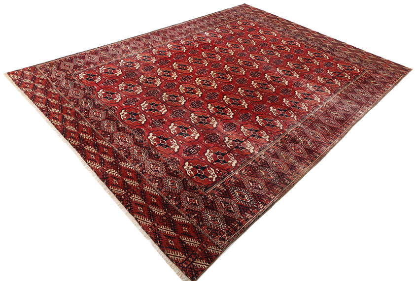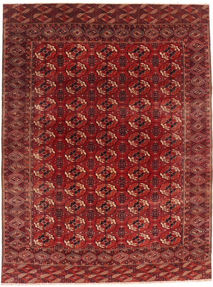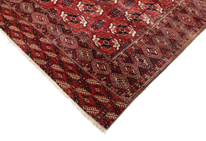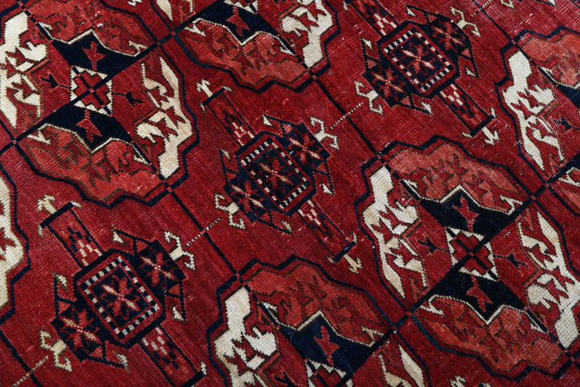 The saturated red ground, achieved through traditional natural dyes, displays a rich tonal depth that has matured beautifully with age. Subtle abrash variations give the surface movement and texture, enhancing the authenticity and visual warmth of the piece. The clarity of the drawing and the disciplined repetition reflect the highly developed weaving tradition of the Tekke Turkmen tribes, where precision, balance and symbolism were central to design.