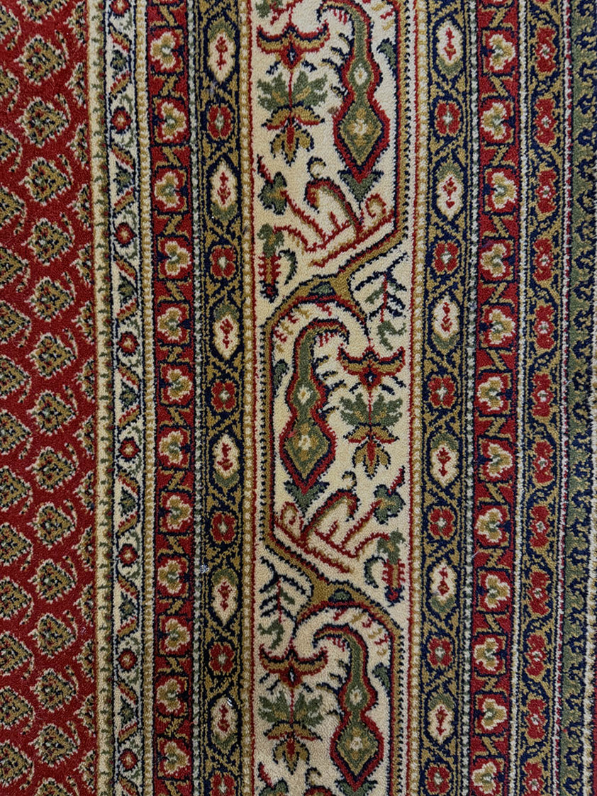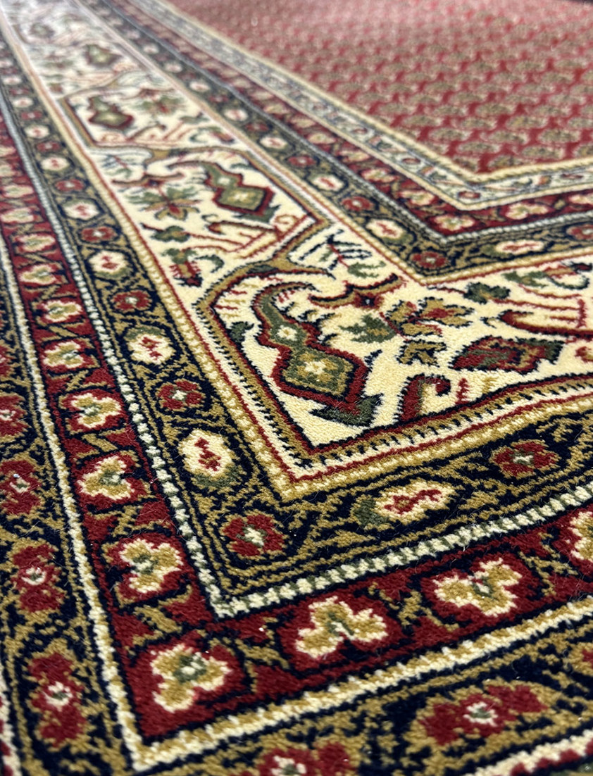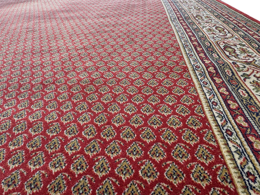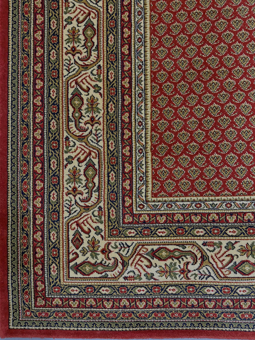 The dense pile provides a firm yet comfortable underfoot feel, suitable for living rooms, dining areas, or formal spaces where a traditional Persian-inspired design is desired without the maintenance considerations of a delicate antique. The balanced palette of deep red, ivory, and subtle brown accents allows it to integrate seamlessly into both classic interiors and more transitional schemes, where heritage patterning is used to anchor contemporary furnishings.
