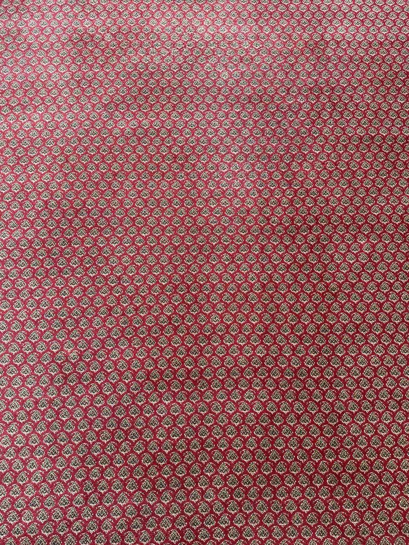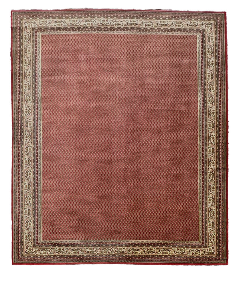 This Belgian Herati Design rug presents a faithful interpretation of one of the most enduring motifs in Persian carpet weaving. The Herati, often referred to as the Mahi (fish) pattern, originated in the historic weaving centres of northeastern Persia, particularly around Herat and the wider Khorasan region. Characterised by its repeating diamond lattice framed by delicate leaf and rosette elements, the design creates a refined all-over field that offers visual depth without the dominance of a central medallion. In this example, the rich red ground is intricately patterned with small-scale motifs, framed by an ivory border adorned with scrolling vinework that lends balance and classical proportion.