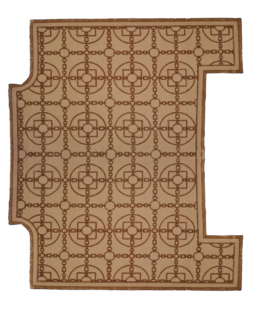Tailored to a bespoke shape, the rug has been expertly crafted to accommodate specific spatial requirements, demonstrating the versatility of hand-tufted construction. The carefully contoured edges and seamless integration of the design across the entire surface highlight the attention to detail involved in its production.