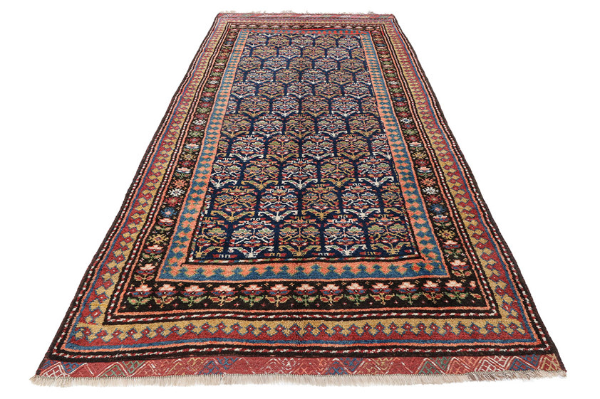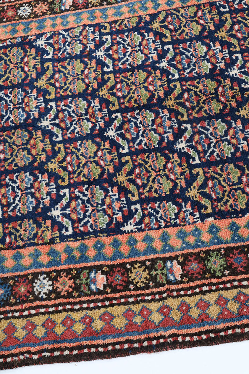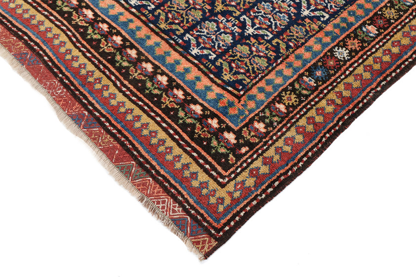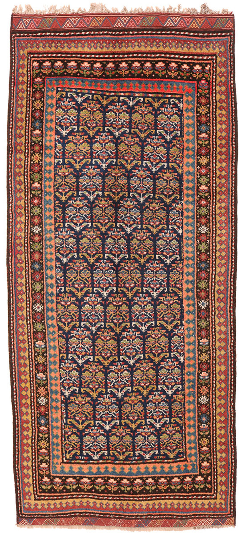 This Antique Caucasian Kurdi rug, woven circa 1930, is a striking example of tribal craftsmanship from the Kurdish weaving traditions of the Caucasus. Characterised by its elongated runner format and bold yet finely balanced proportions, the rug features a deep indigo field organised into a disciplined lattice of stylised floral and botanical motifs, each rendered with a distinctly geometric hand. The precision of the repeat pattern is softened by the expressive irregularities typical of village and nomadic production, giving the piece both structure and vitality.
