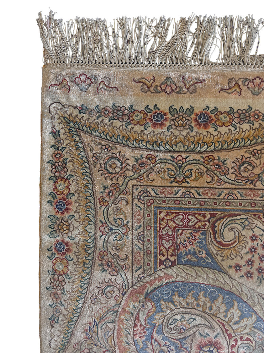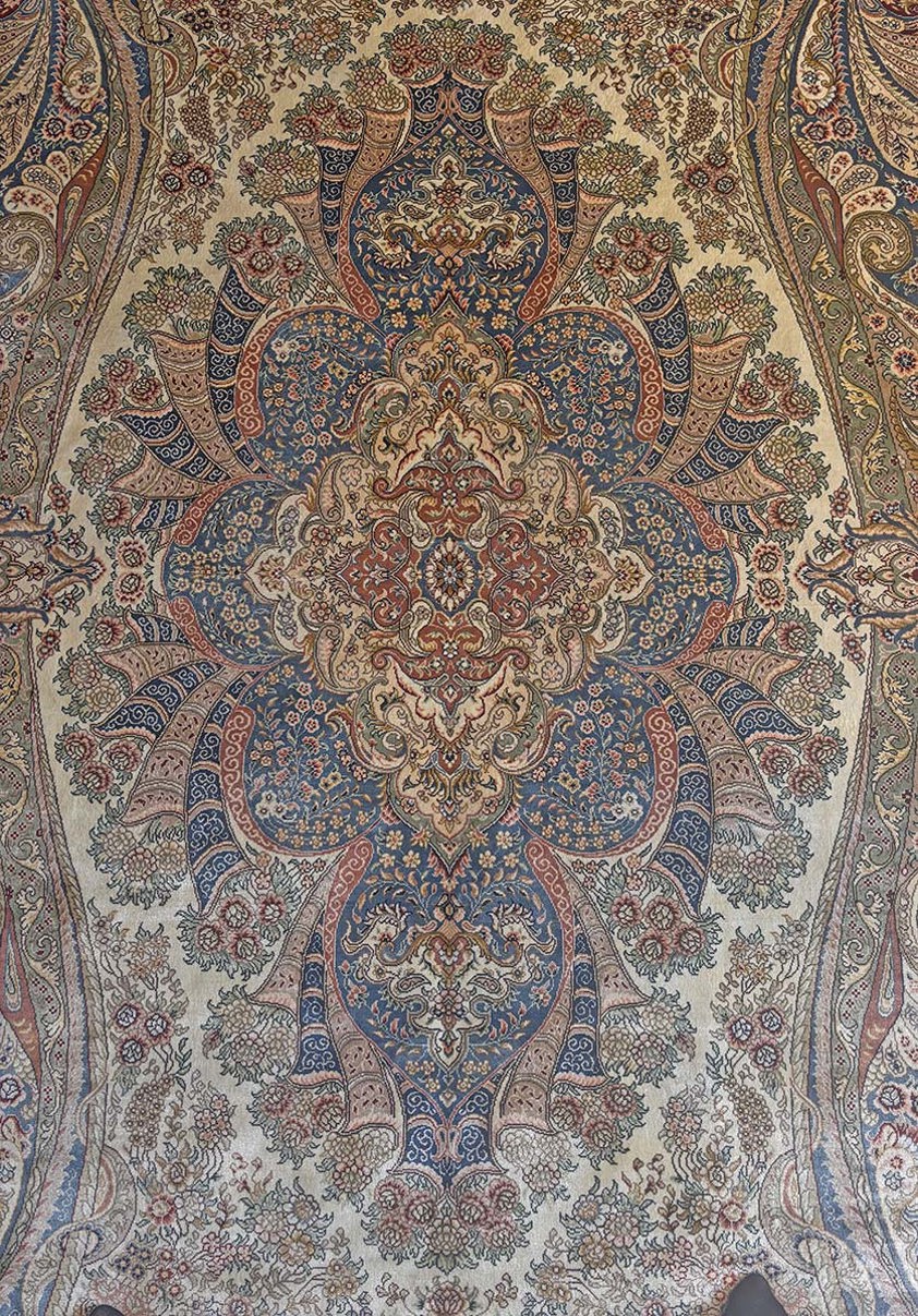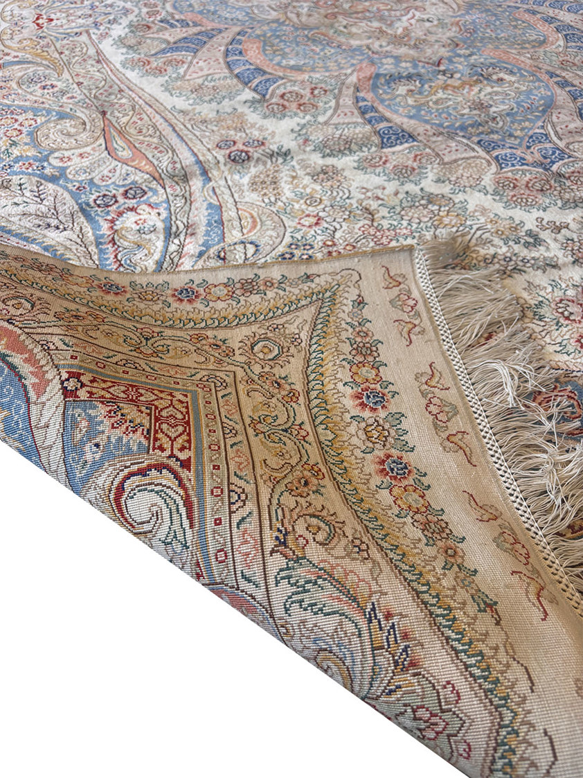 Woven entirely from silk—both in the pile and the foundation—this rug possesses a natural sheen that allows the colours to subtly shift with changing light. The fine silk fibres enable extraordinary detail, evident in the elaborate scrolling floral motifs, delicate arabesques, and flowing paisley elements that frame the central medallion. The ivory ground provides a refined backdrop for the harmonious palette of soft blues, warm reds, and subtle gold tones, creating a design that is both intricate and balanced.