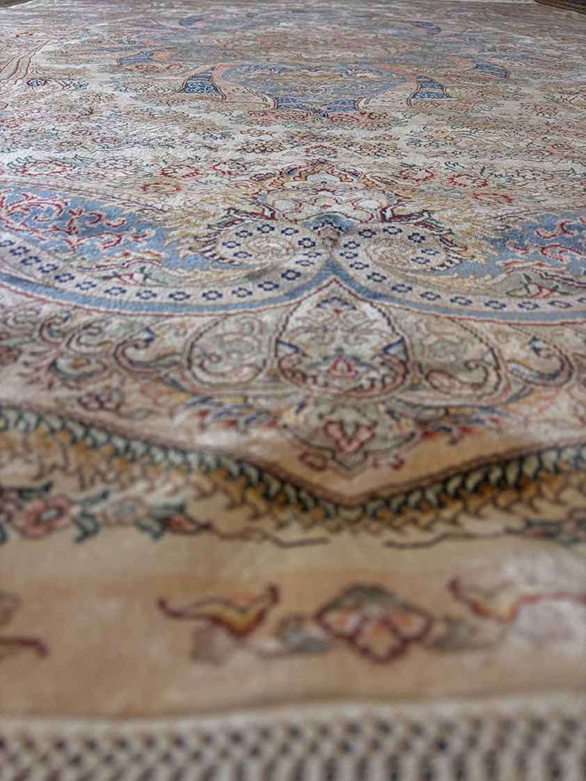 Silk-on-silk construction produces a particularly supple and lightweight rug while maintaining remarkable strength. These pieces are often considered among the most luxurious examples of Persian weaving, prized not only for their beauty but also for their technical sophistication. The fine knotting, shimmering surface, and intricate pattern make this rug well suited to elegant interiors where craftsmanship and detail can be appreciated.