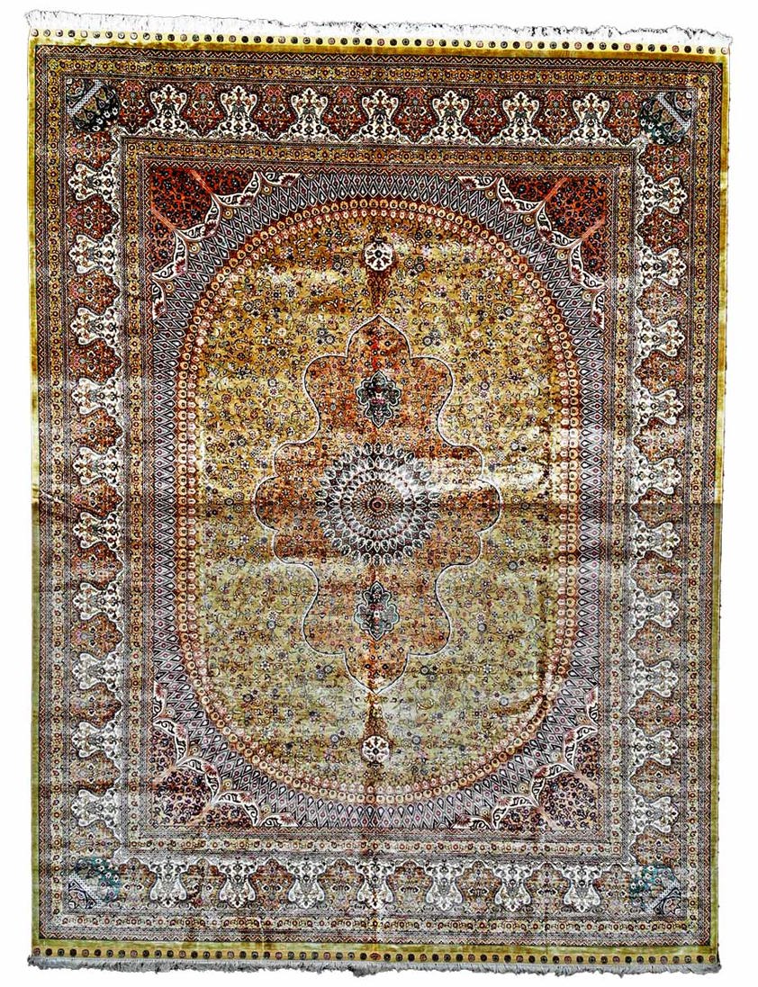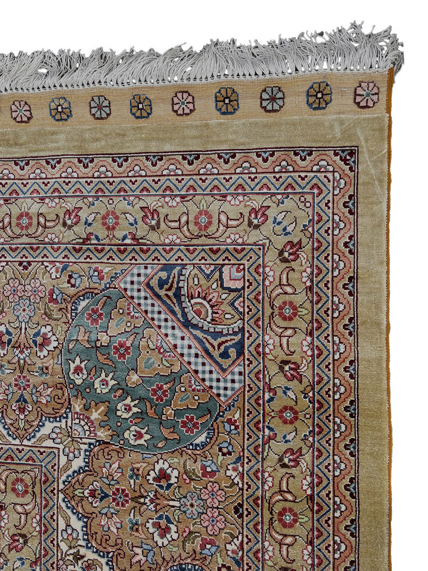 Qum, located south of Tehran, emerged as a major weaving centre in the 20th century, specialising in silk rugs of exceptional fineness. Unlike older tribal weaving regions, Qum workshops developed an atelier-style production model focused on master weavers and highly detailed court-inspired designs. Silk-on-silk construction, combined with a high knot count such as 100–150 knots per square centimetre, places this rug firmly within the upper tier of Persian craftsmanship, prized for both its structural integrity and artistic precision.