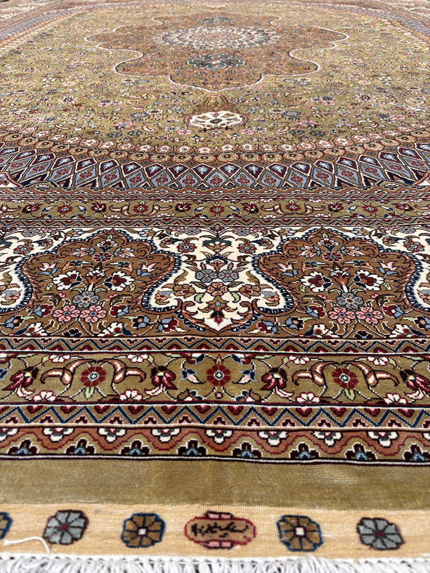 The border system is richly layered, incorporating repeating floral motifs and stylised arabesques, all executed with microscopic precision. Accents of rust, ivory, charcoal, and muted jade create depth and contrast, while the silk’s natural sheen enhances every tonal variation, lending the rug a refined brilliance characteristic of high-grade Qum silk production.