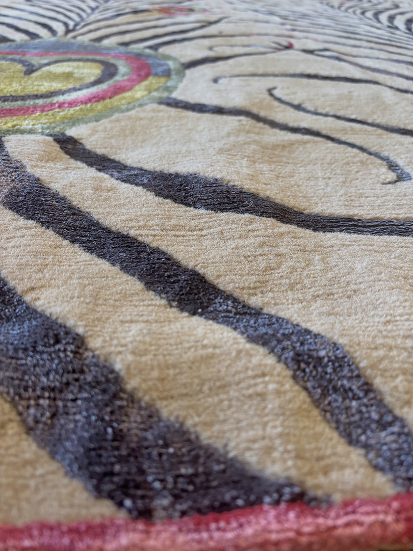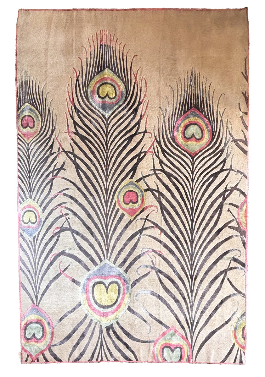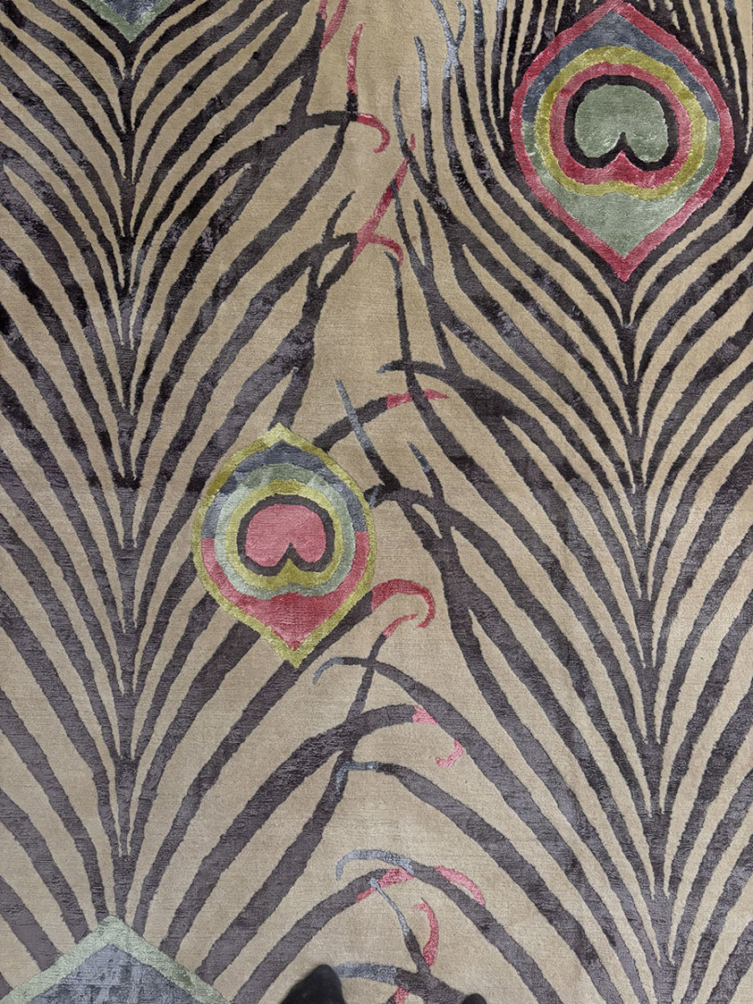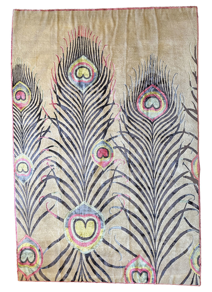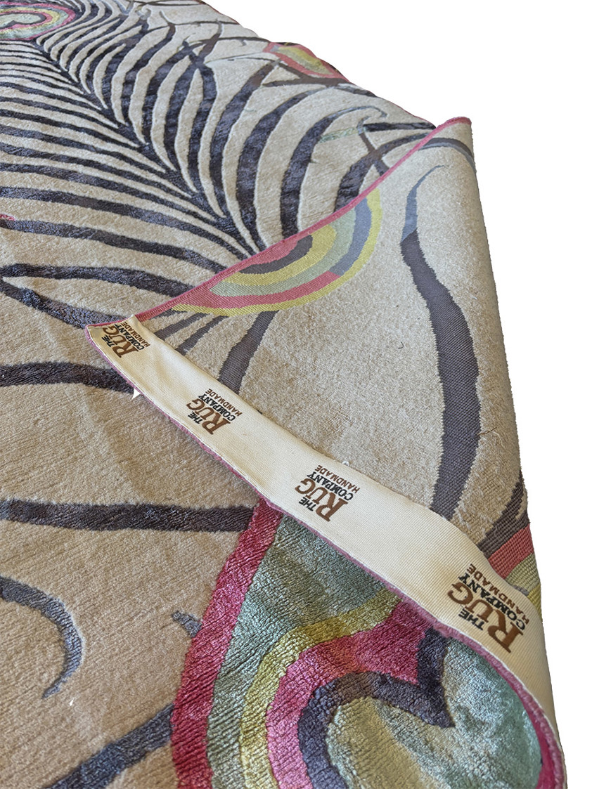 Details: Peacock design by Matthew Williamson for The Rug Company; overscale feather motifs with Ikat-style banding; woven in a wool and bamboo silk blend on a soft beige ground highlighted with pink, green, blue and dark linear accents.