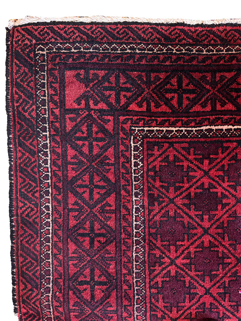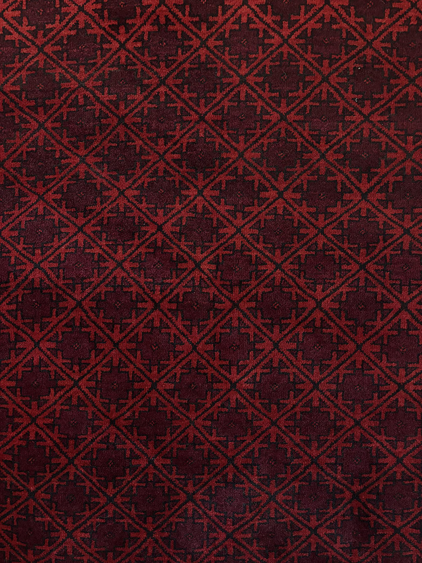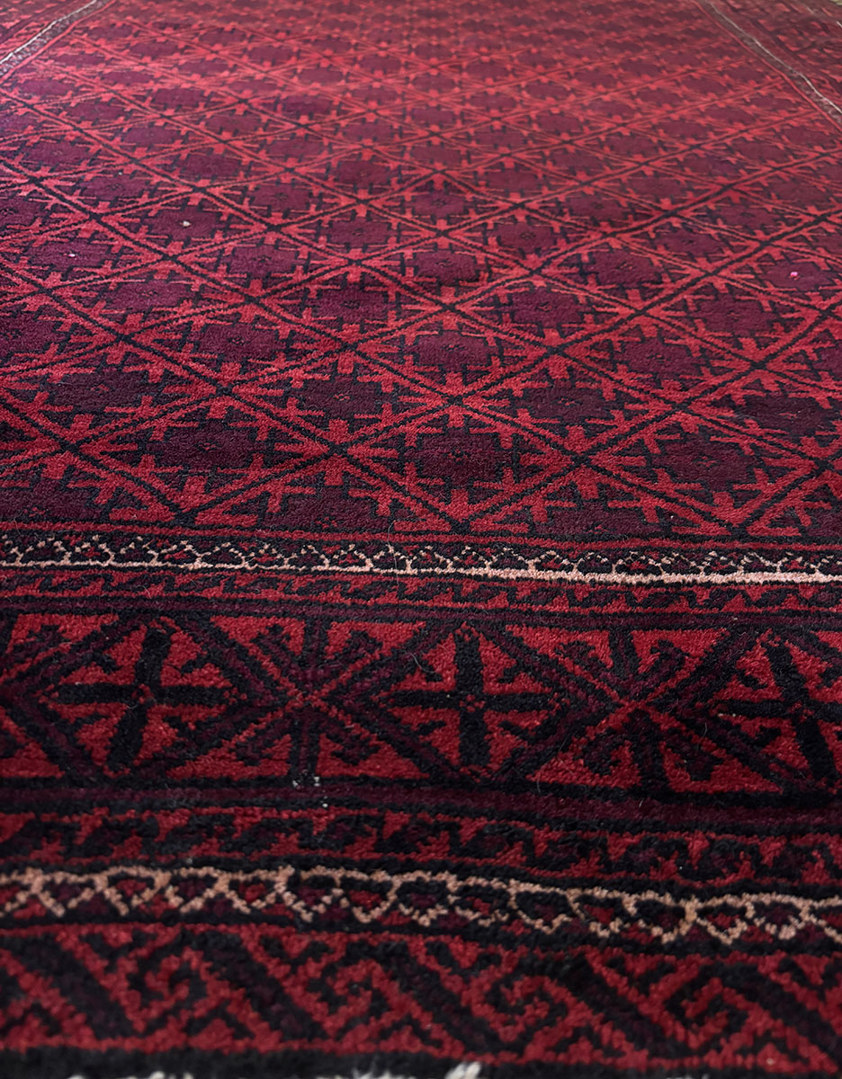The field of this piece is dominated by a rich, almost velvety crimson ground layered with darker aubergine undertones. Across the surface runs an all-over lattice of small, angular motifs arranged in a precise diamond grid. This repeating structure gives the rug a strong architectural presence while maintaining the intimate scale typical of Baluch craftsmanship. The subtle variation within the red dyes creates depth and movement, allowing the pattern to shift gently in changing light.