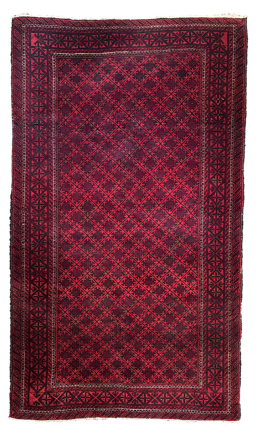 The borders frame the composition with multiple guard stripes and a bold main band of geometric devices rendered in deep claret and black. These motifs echo the lattice within the field, reinforcing the rug’s cohesive visual language. The restrained use of colour—primarily reds, burgundy, and near-black—reflects the traditional Baluch aesthetic, where darker tones were favoured both for their dramatic effect and their practical resilience in everyday use.