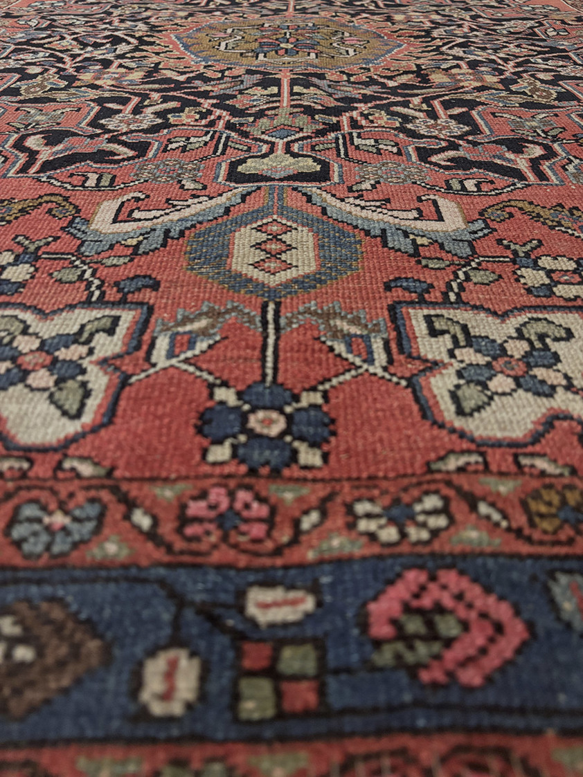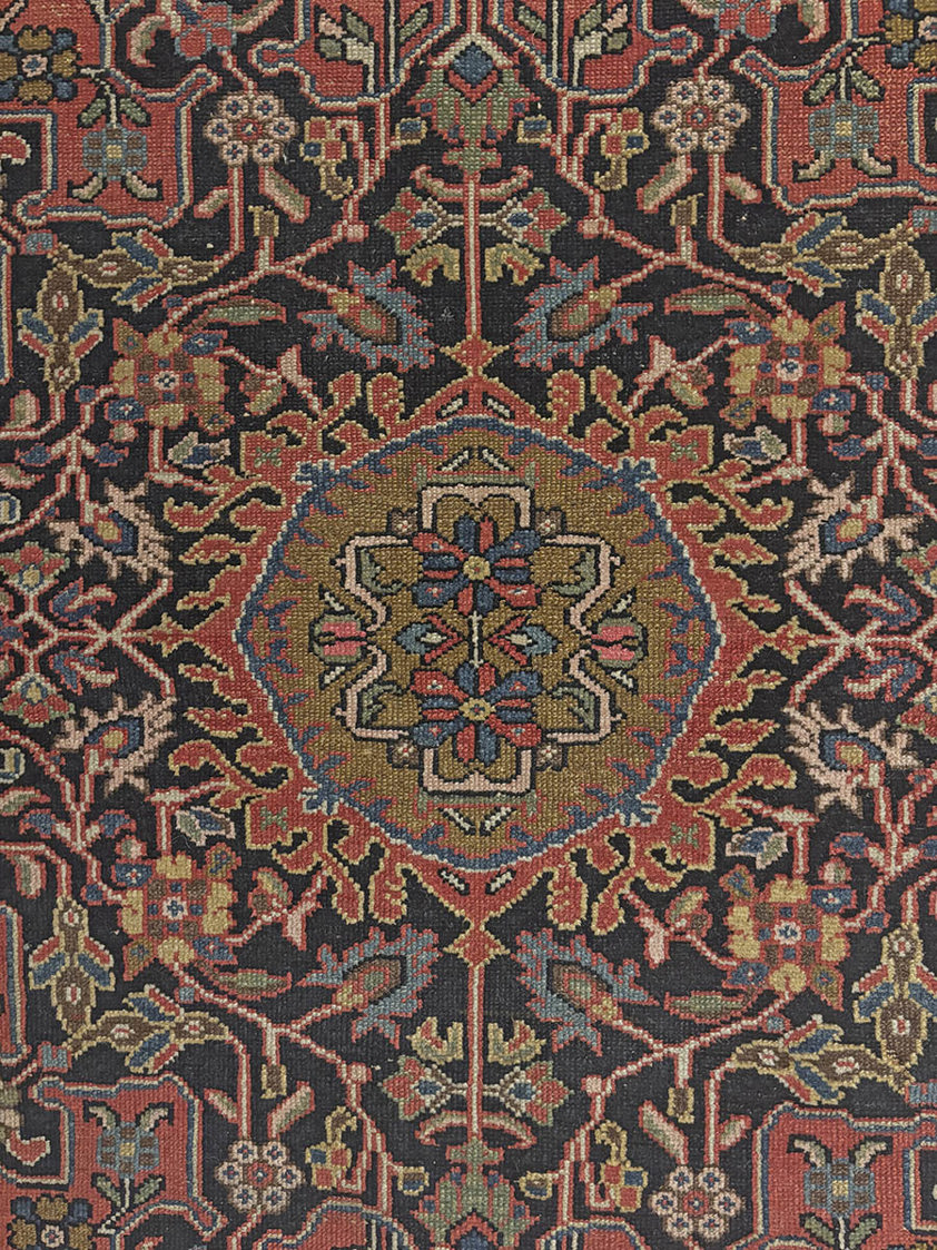 Visually, this piece carries the hallmarks that collectors and designers look for in Sarouk work. A warm coral-red field sets a confident foundation, framed by a deep navy border that gives the rug a crisp architectural outline. At the centre sits an olive-gold medallion, surrounded by a dense midnight-toned lattice of scrolling vines, palmettes and stylised blossoms. Ivory corner spandrels lift the composition and add light, while the border’s repeating floral motifs keep the design disciplined and complete, creating a strong sense of proportion from edge to edge.
